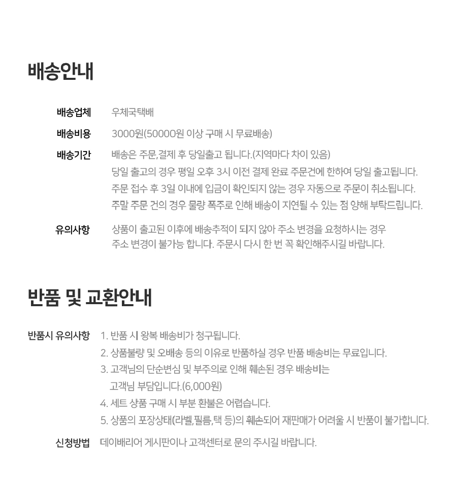 배송비 : 3,000원(50,000원 이상 구매 시 무료)
